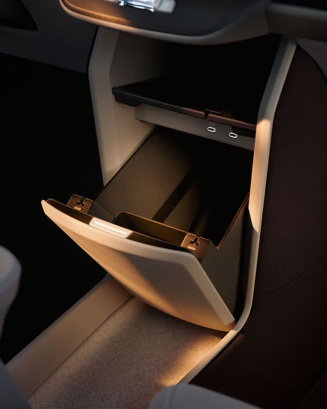 A Volvo EX60 nyitott kesztyűtartója felnyitott fedéllel, fölötte vezeték nélküli telefontöltő felület és két USB-C port.